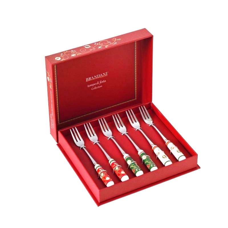 Sada 6 vidliček z nerezové oceli. Vidličky mají jemně zdobenou keramickou rukojeť a jsou vhodné do myčky na nádobí.Rozměry: 16 cm Italský design plný elegance a originality, to je Brandani, italský výrobce designového nábytku a bytových doplňků. Designéři se snaží o to, aby každý navržený výrobek...