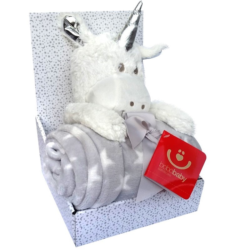 Dárkový set - dětská hračka JEDNOROŽEC bílá/šedá s mikrovláknovou dekou 75X100 cm