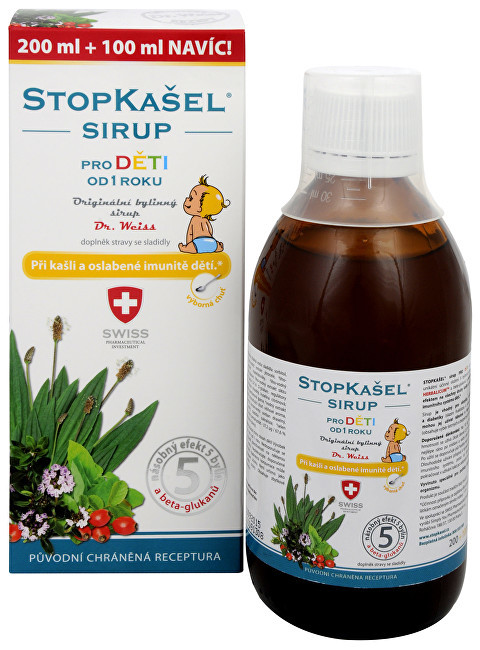 StopKašel sirup Dr. Weiss pro děti od 1 roku s výbornou chutí obsahuje unikátní účinnou kombinaci beta-glukanů a 5 bylinných extraktů Herbalicum (jitrocel, šípek, mateřídouška, bazalka, sléz) s násobným efektem na všechny druhy kašle a k normální činnosti imunitního systému dětí.