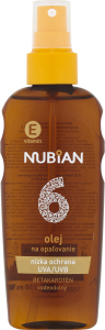 Olej na opalování Nubian OF 6 s betakarotenem, nízká ochrana s kombinací UVA / UVB filtrů chrání pokožku před slunečním zářením. Snadno a rychle se aplikuje. prečítať celé