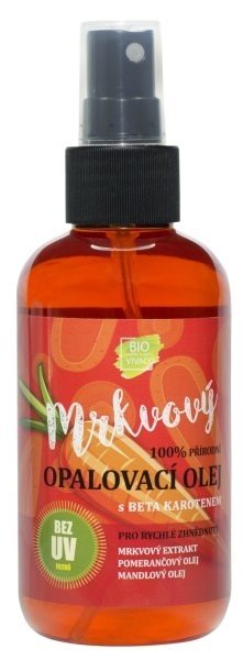 Přírodní opalovací mrkvový olej pro rychlé opálení aktivuje pleťové buňky při slunění a díky přirozenému obsahu beta karotenu podporuje rychlejší a dlouhodobé opálení pleti. Lehce se roztírá, pomáhá udržet pružnost pokožky a je vhodný i pro regeneraci a hydrataci pokožky po slunění. Dopřejte své pokožce bronzové opálení bez parabenů, umělých barviv a konzervantů.