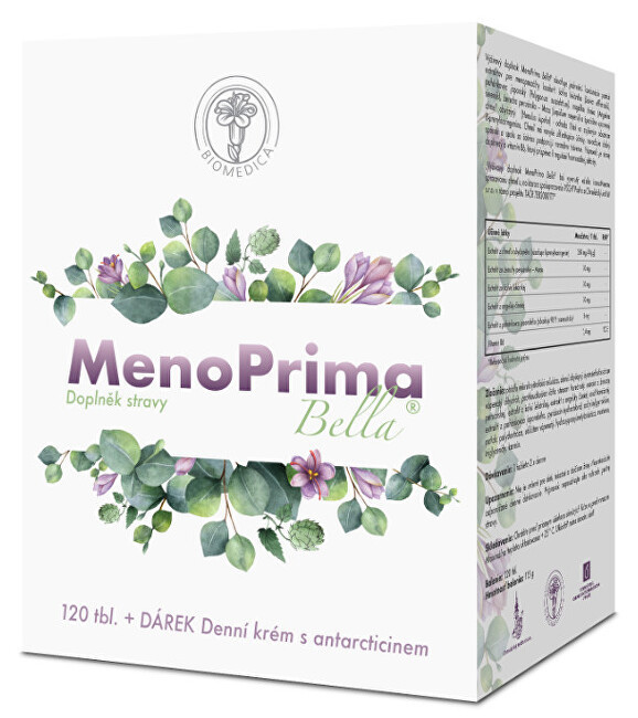 MenoPrima Bella je doplněk stravy, který obsahuje jedinečnou kombinaci čtyř extraktů pro menopouzální komfort: šalvěj lékařská, andělika čínská, řeřicha peruánská a speciálně upravený chmel otáčivý.