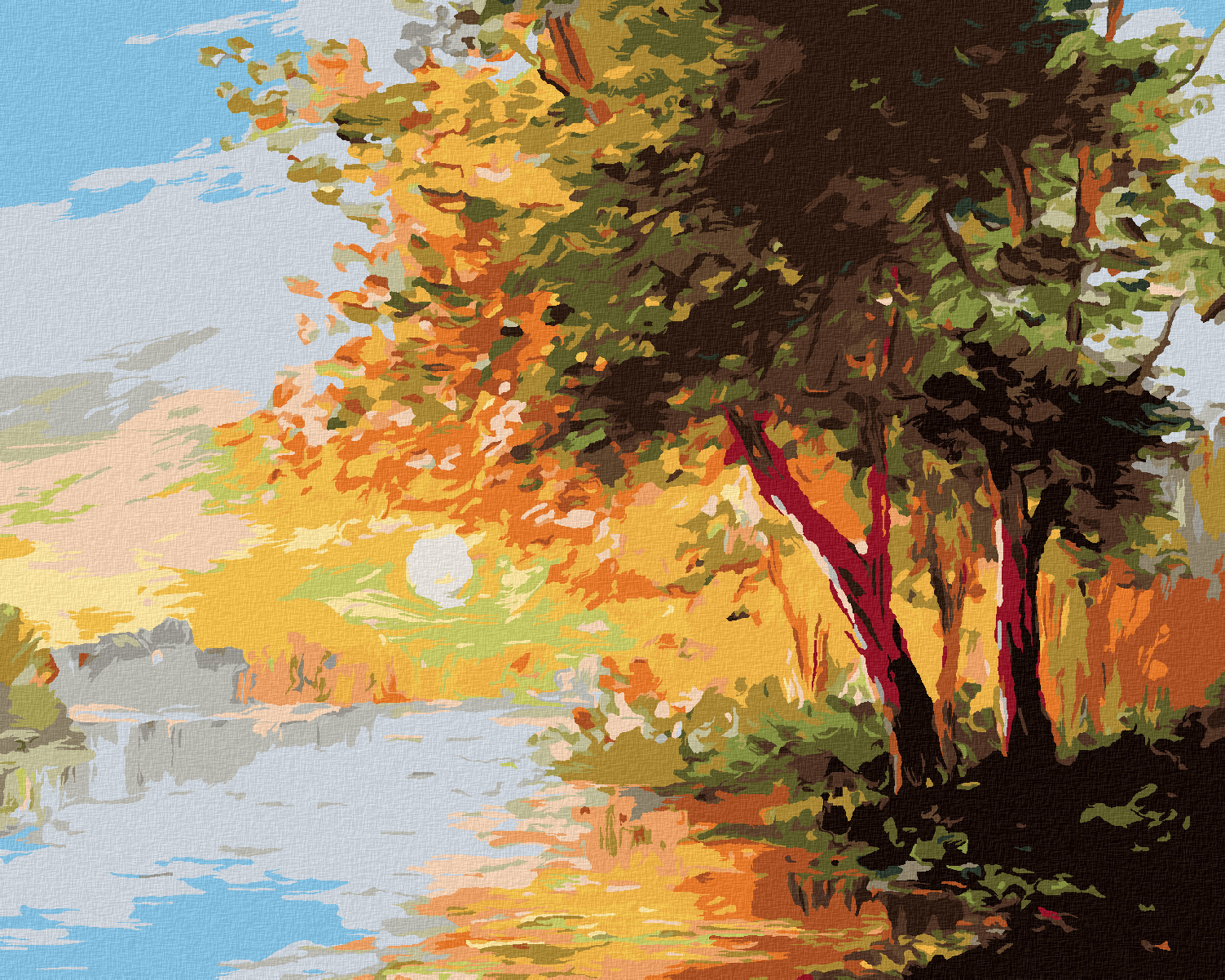 Malování podle čísel - ŘEKA V JARNÍM LESE A ZÁPAD SLUNCE - 80x100 cm, bez rámu a bez vypnutí plátna