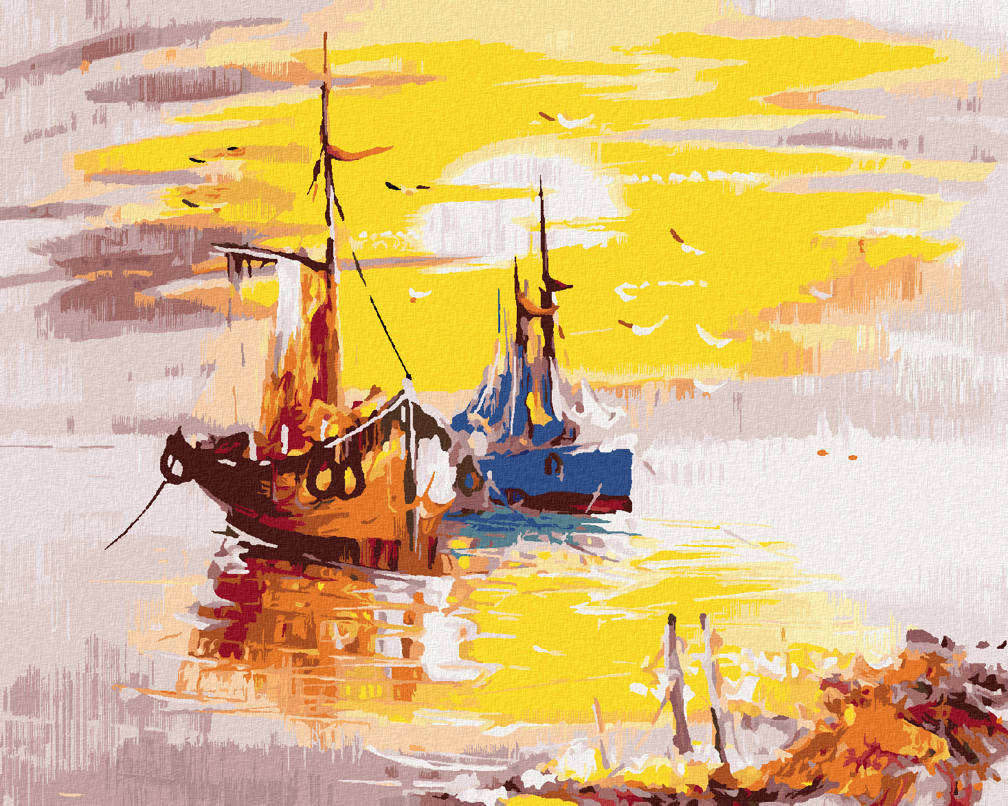 Malování podle čísel - MALOVANÉ LODĚ A ZÁPAD SLUNCE - 80x100 cm, bez rámu a bez vypnutí plátna