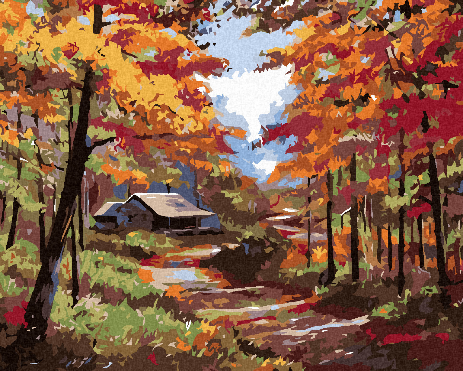 Malování podle čísel - CHALUPA V PODZIMNÍM LESE - 80x100 cm, bez rámu a bez vypnutí plátna