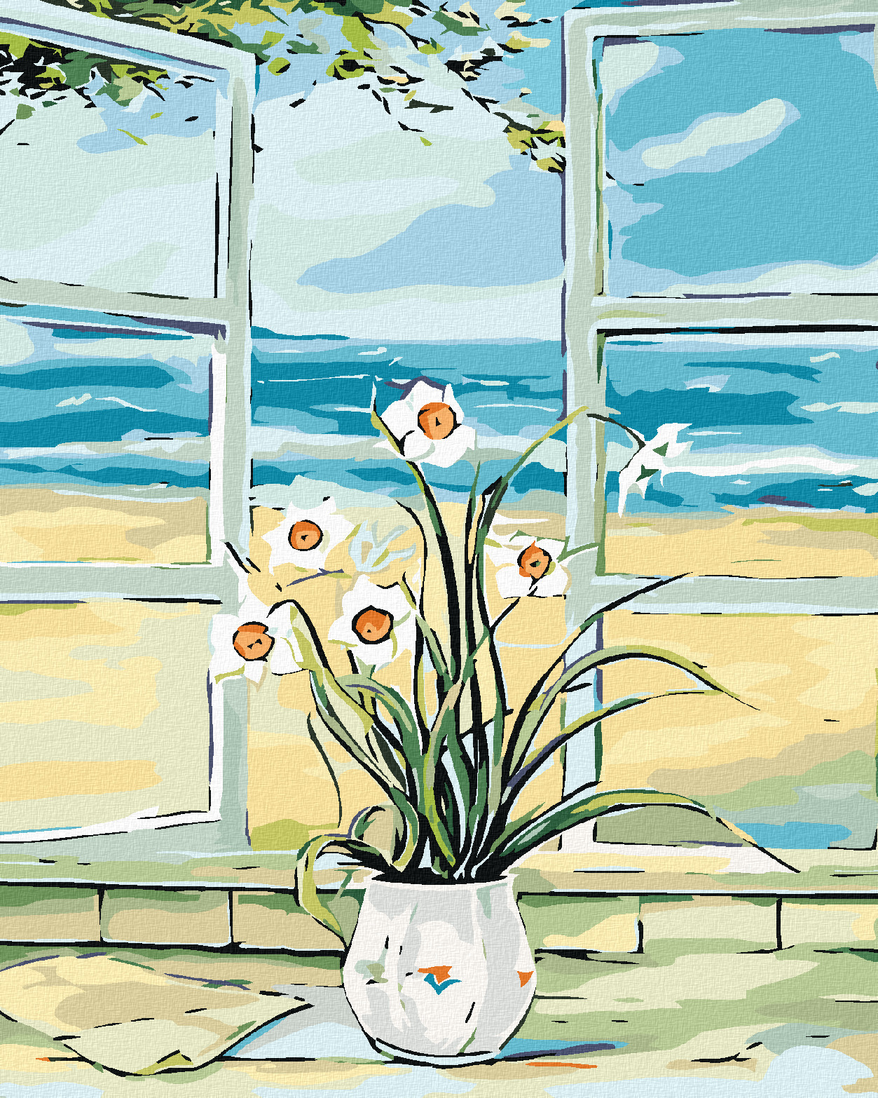 Malování podle čísel - NARCIS V OKNĚ U PLÁŽE - 80x100 cm, bez rámu a bez vypnutí plátna