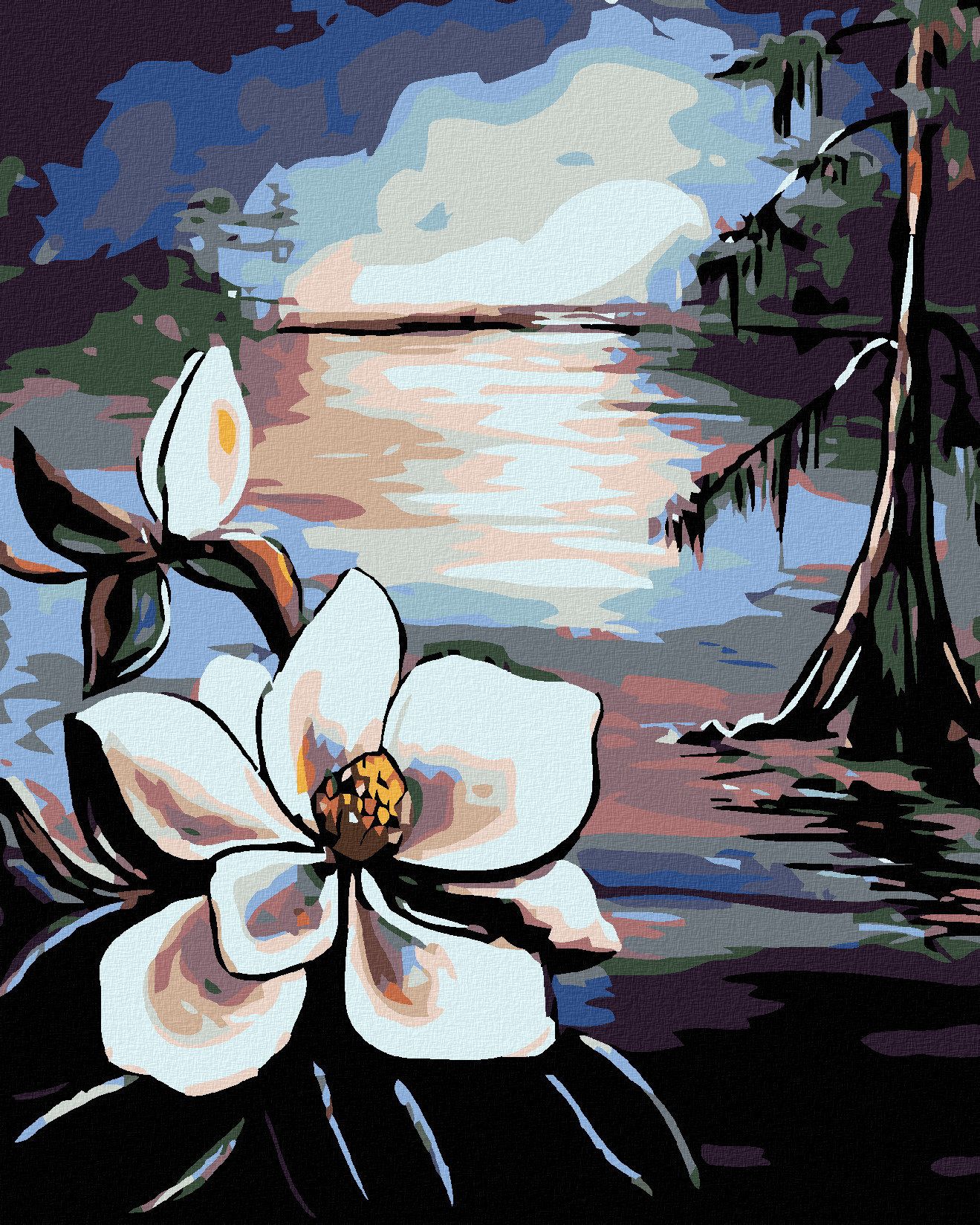 Malování podle čísel - KRÁSNÁ KVĚTINA A STARÝ STROM U JEZERA - 80x100 cm, vypnuté plátno na rám