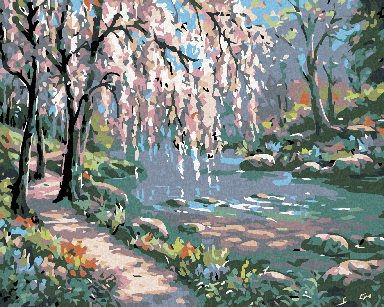 Malování podle čísel - RŮŽOVÝ STROM NAD ŘEKOU - 80x100 cm, bez rámu a bez vypnutí plátna