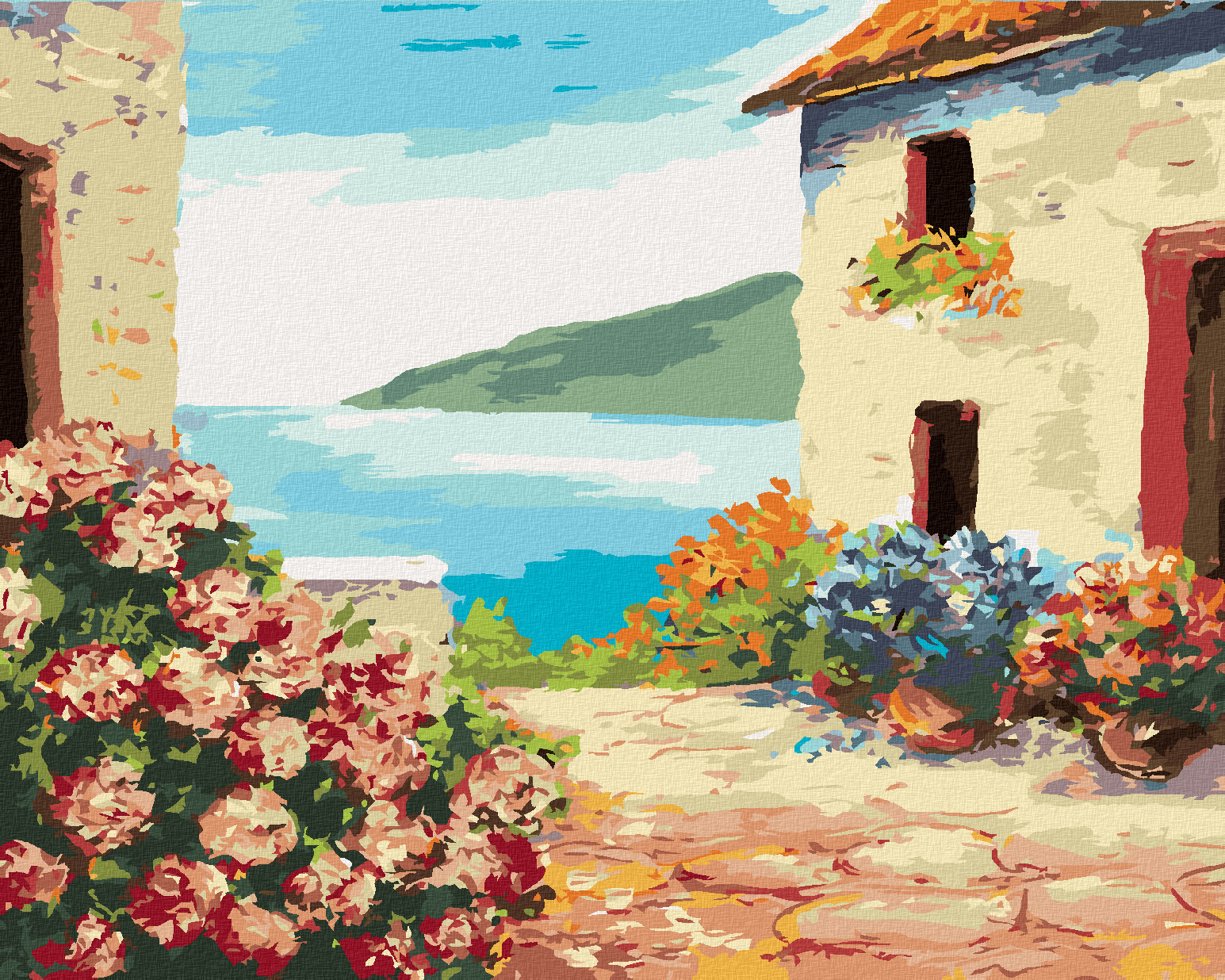 Malování podle čísel - DŮM U MOŘE A KVĚTINY - 80x100 cm, vypnuté plátno na rám