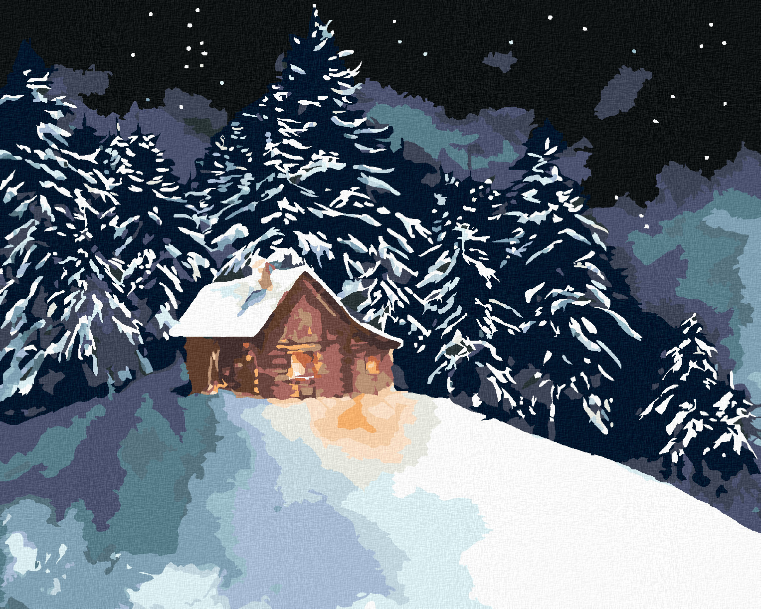 Malování podle čísel - LESNÍ SRUB NA ZASNĚŽENÉM KOPEČKU - 80x100 cm, bez rámu a bez vypnutí plátna