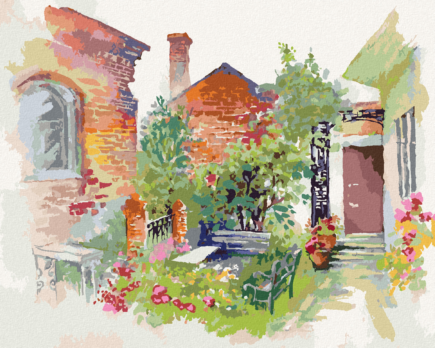 Malování podle čísel - EVROPSKÁ KRAJINA S DOMY A KVĚTINAMI - 40x50 cm, vypnuté plátno na rám