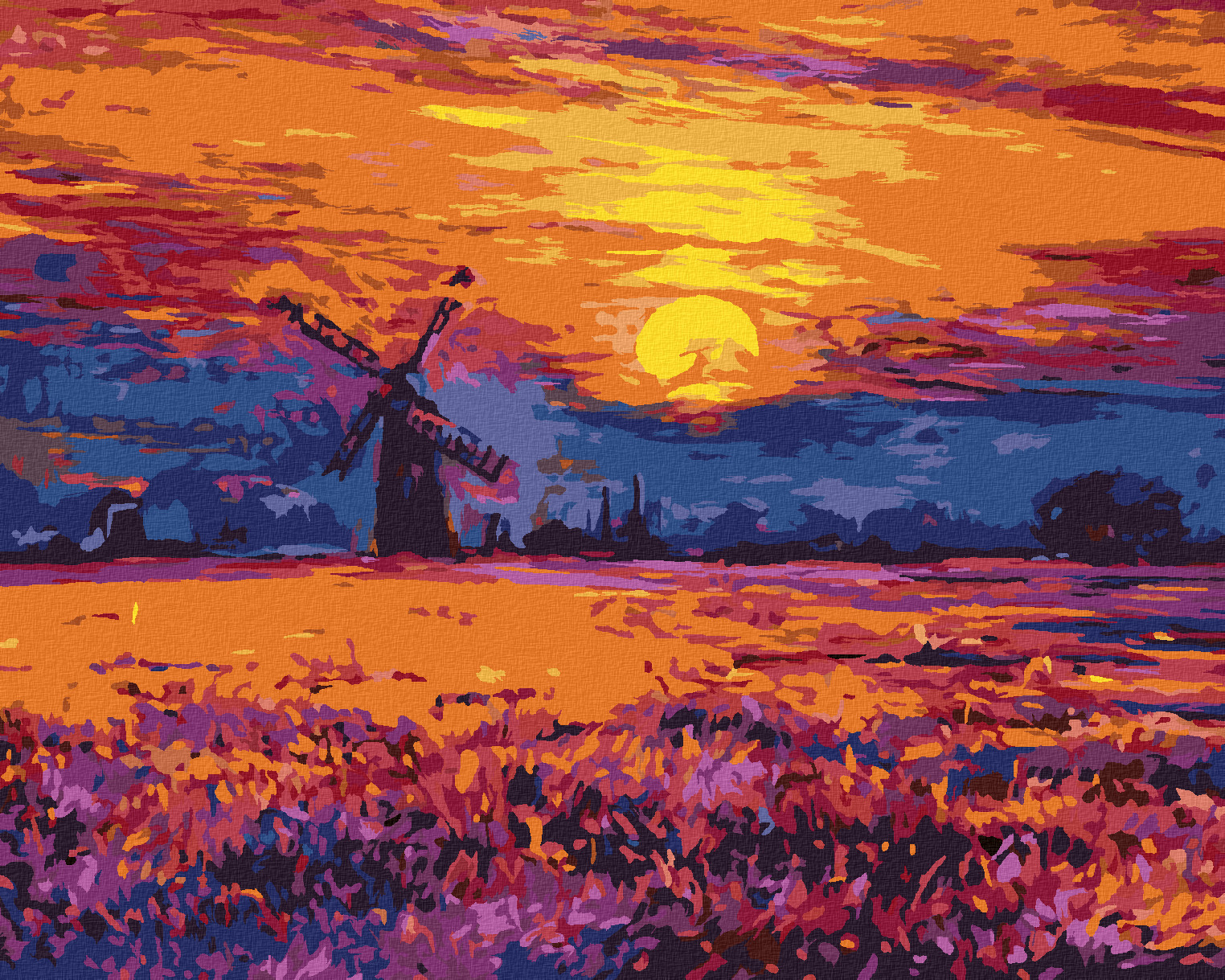 Malování podle čísel - BAREVNÝ ZÁPAD SLUNCE A VĚTRNÝ MLÝN - 40x50 cm, vypnuté plátno na rám
