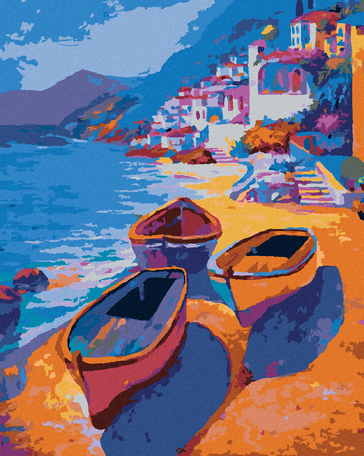Malování podle čísel - BAREVNÉ LOĎKY NA BŘEHU - 80x100 cm, vypnuté plátno na rám