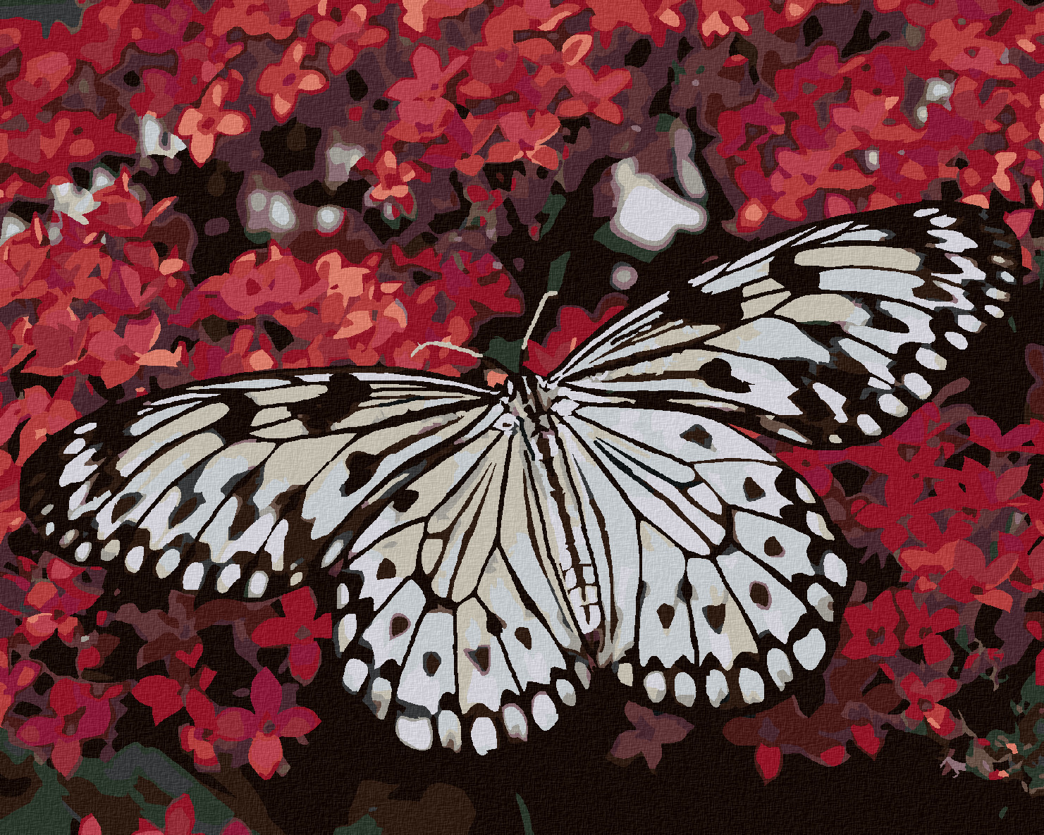 Malování podle čísel - BÍLÝ MOTÝL A ČERVENÉ KVĚTINY - 80x100 cm, bez rámu a bez vypnutí plátna