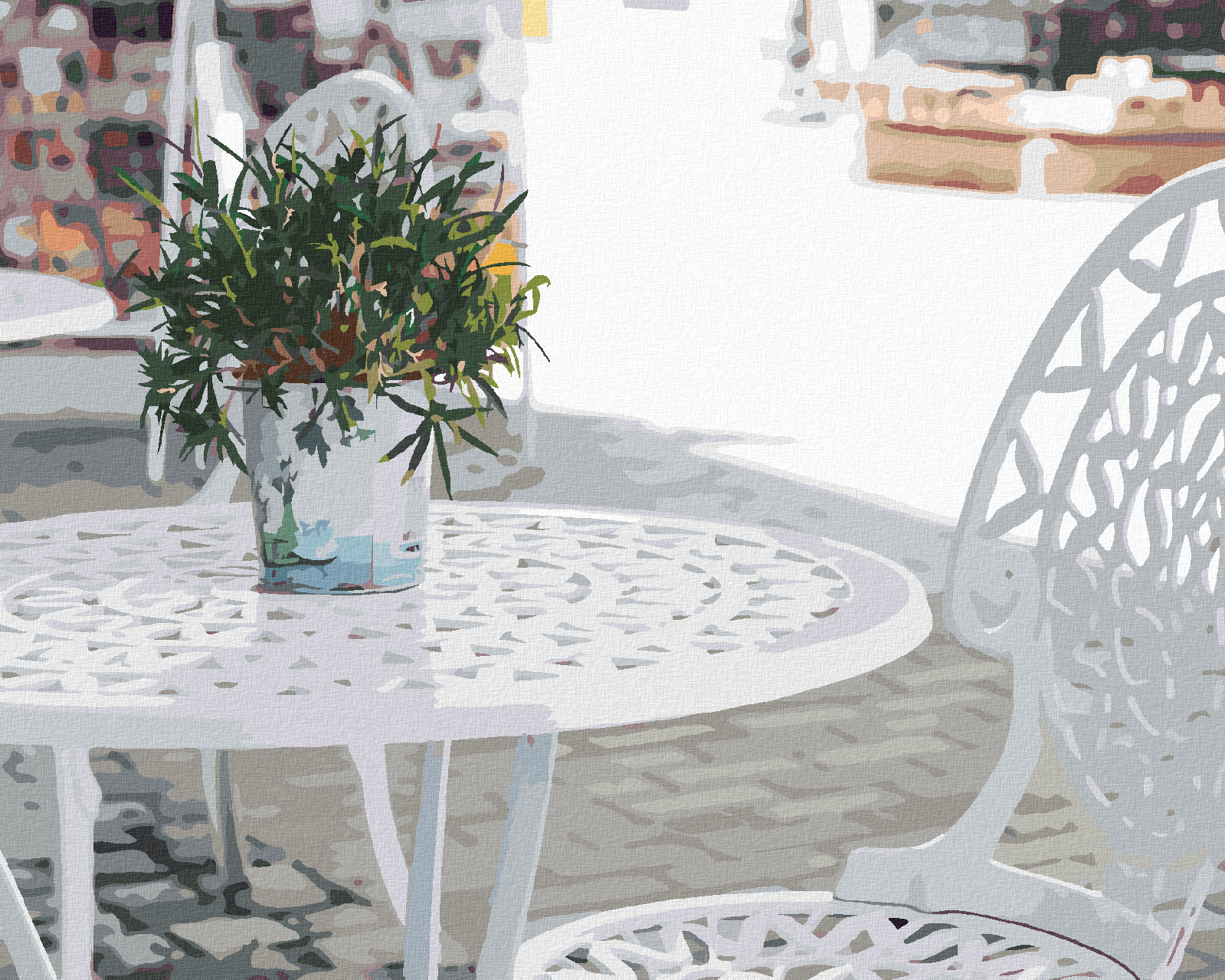 Malování podle čísel - KVĚTINY NA BÍLÉM NÁBYTKU V KAVÁRNĚ - 80x100 cm, bez rámu a bez vypnutí plátna