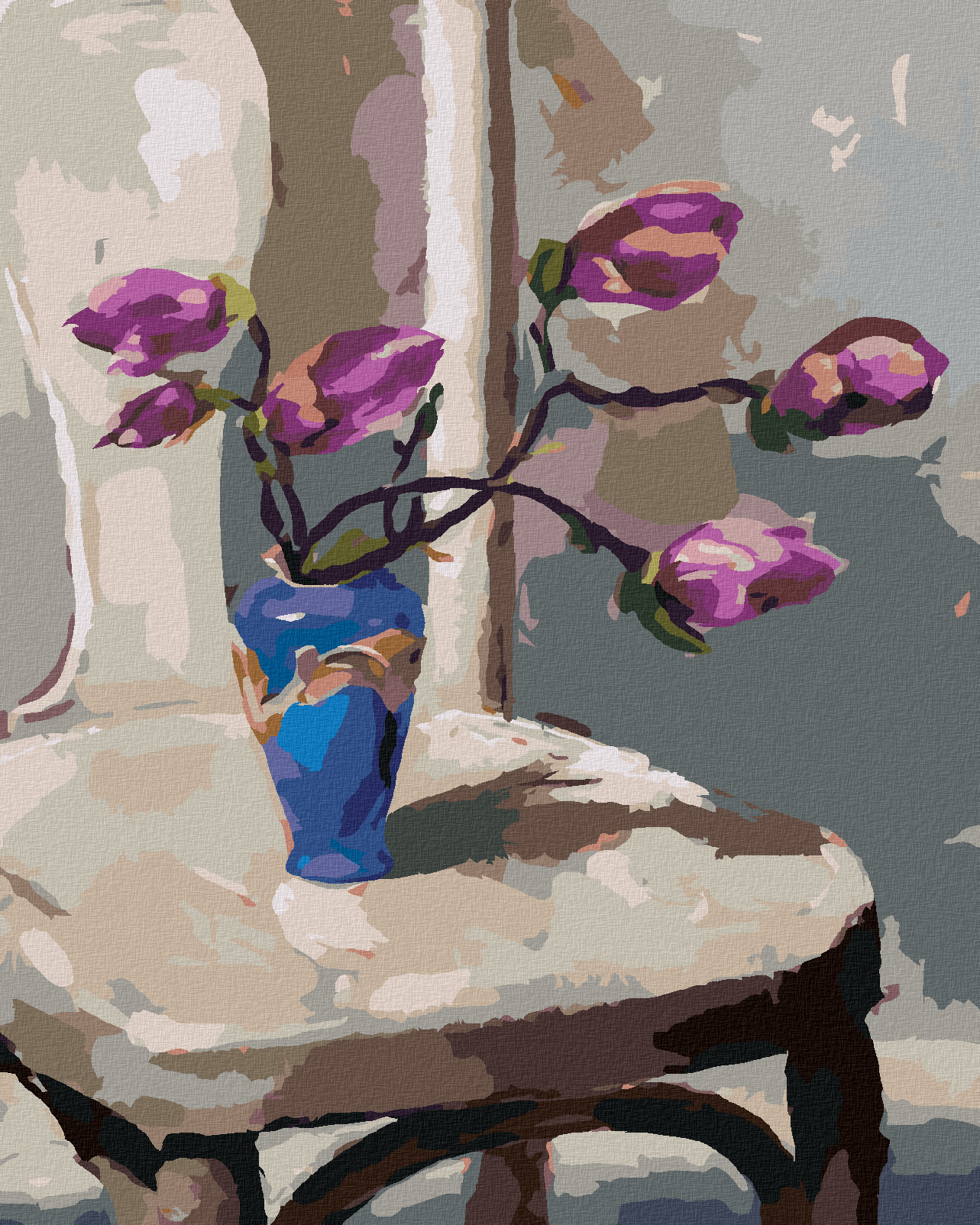 Malování podle čísel - MAGNÓLIE VE VÁZE NA ŽIDLI - 40x50 cm, vypnuté plátno na rám