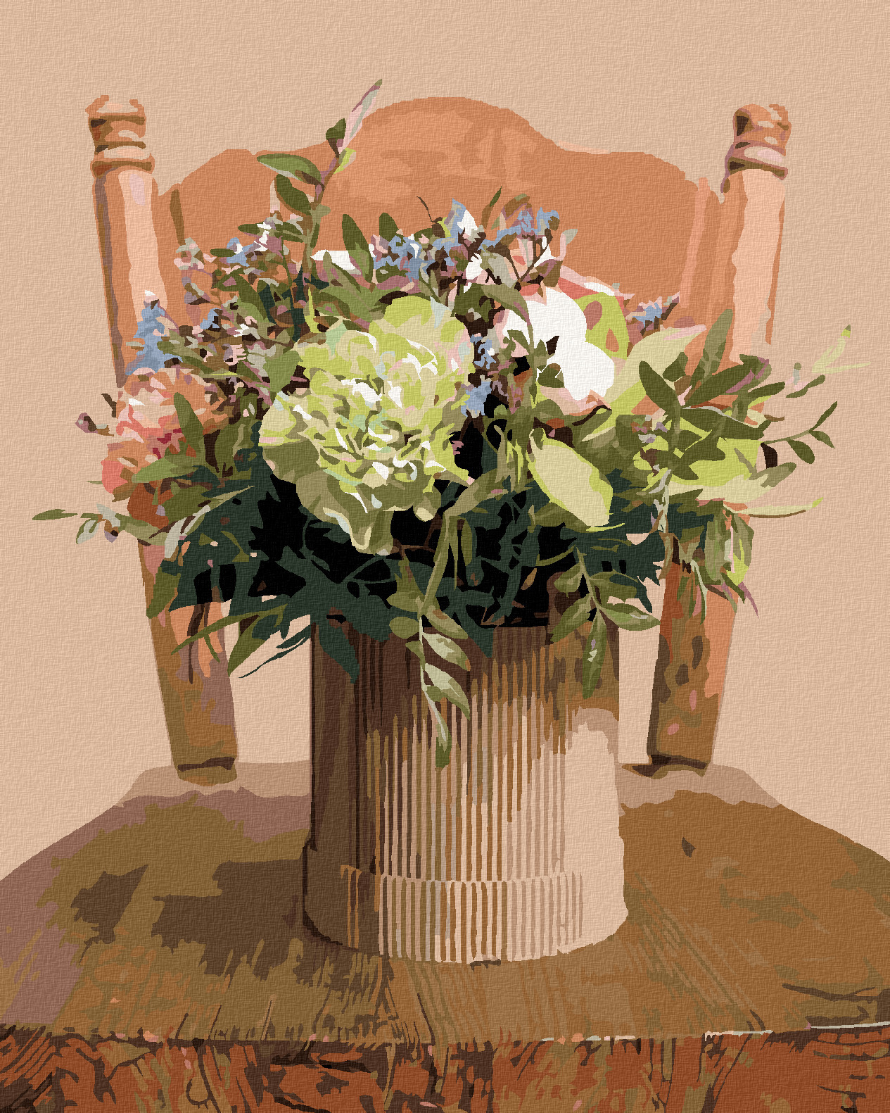 Malování podle čísel - KYTICE V LEPENKOVÉ VÁZE NA ŽIDLI - 40x50 cm, bez rámu a bez vypnutí plátna