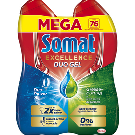 Somat Excellence Gel Anti-Grease - nejlepší složení Somat gelu s technologií hloubkového čištění, díky které proniká i mezi odolnou špínu a pomáhá jejímu odstranění. Unikátní dvoukomorová láhev umožňuje kombinaci dvou efektivních látek - pro silné odmašťovací účinky a extra sílu proti připáleninám.