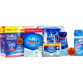 Finish 4v1 Promo Pack obsahuje All in1 Max 48 ks + Čistič myčky 250 ml + Leštidlo Lemon 400 ml + Sůl 1,5 kg a dezinfekční spray Lysol 400ml ZDARMA.