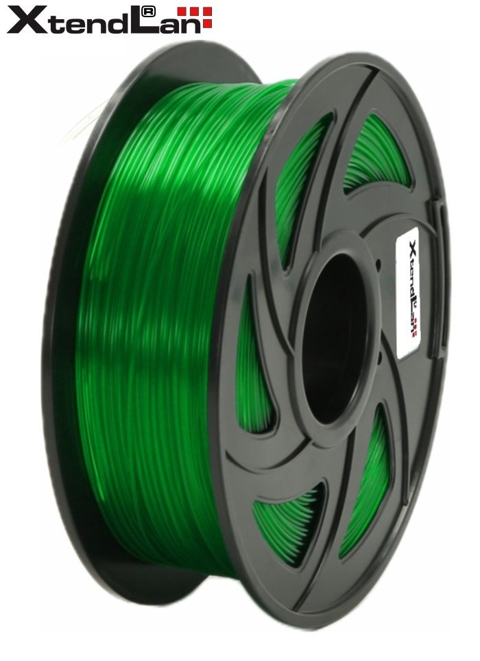 XtendLAN PETG filament 1,75 mm průhledný zelený 1 kg Plastové vlákno (filament) pro 3D tisk, v návinu na cívce. PET-G (PolyEtylénTereftalát Glykolem modifikovaný) je materiál velmi známý díky plastovým lahvím. PETG v sobě spojuje to nejlepší z vlastností ABS a PLA pro 3D tisk. Jde o pevný a...