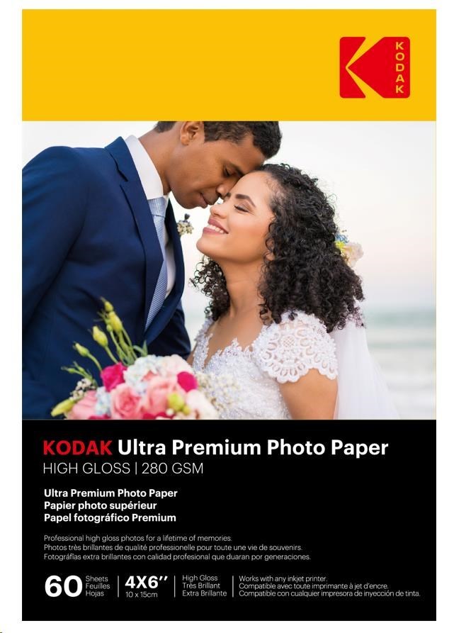 KODAK Ultra Premium Photo RC Gloss (280g/m2) 10×15 (4R) - 60 listů Prémiový fotografický papír formátu 10×15 (4R) je vhodný pro všechny inkoustové tiskárny. Gramáž 280 g/m2 představuje variantu pro nejnáročnější použití. Vytiskněte si profesionální fotografie s vysokým leskem...