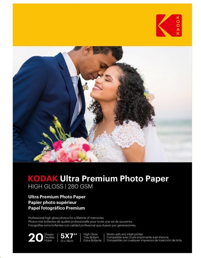 KODAK Ultra Premium Photo RC Gloss (280g/m2) 13×18 - 20 listů Prémiový fotografický papír formátu 13×18 je vhodný pro všechny inkoustové tiskárny. Gramáž 280 g/m2 představuje variantu pro nejnáročnější použití. Vytiskněte si profesionální fotografie s vysokým leskem pro...