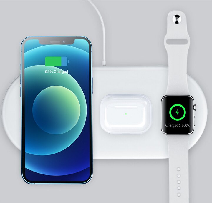 Bezdrátová nabíječka s 3 Qi nabíječkami pro dva mobilní telefony a 1x Apple Watch.Součástí nabíječky je nabíjecí kabel s USB konektorem. prečítať celé