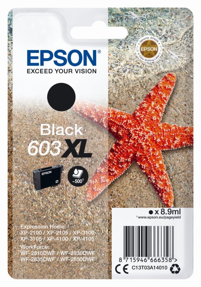 Epson 603XL černá Značková náplň pro vaši inkoustovou tiskárnu Epson zajistí maximální kvalitu tisku. ZÁKLADNÍ SPECIFIKACEPro tiskárny: Epson Expression Home XP-2100, XP-2105, XP-3100, XP-3105, XP-4100, XP-4105, WorkForce WF-2810DWF, WF-2830DWF, WF-2835DWF, WF-2850DWFBarva: černáObjem: 8,9 ml