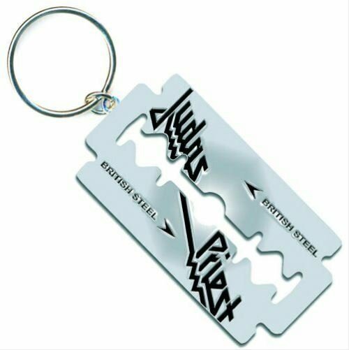 Kovový přívěsek na klíče vyvedený v motivu žiletky s logem skupiny Judas Priest.