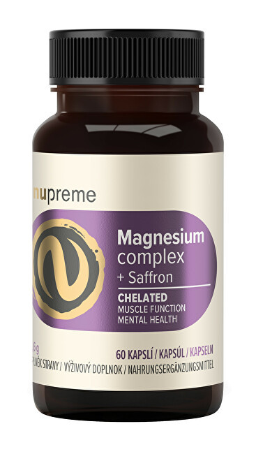 Doplněk stavy Magnesium + šafrán chelát obsahuje kombinaci tří organických forem hořčíku (bisglycinát, taurát a treonát), vitamin B6 a extrakt šafránu.
