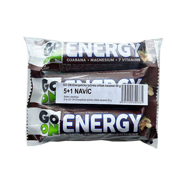 Energetická tyčinka Go on oříšek karamel 50 g 5+1 navíc v mléčné čokoládě. Obohacena o guaranu, hořčík a vitamíny. Tato výživná svačinka dodá energii při všech Vašich aktivitách. Díky kombinaci kousků arašídů a karamelu má tyčinka vynikající chuť.Výživové hodnoty:Výživové údaje v 100 g/v 50...