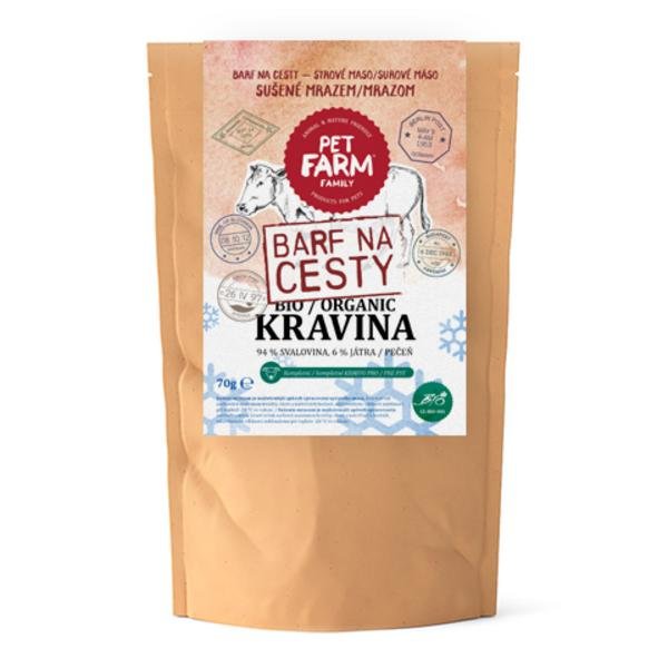 "PFF BIO Kravina - BARF na cesty 70g. BARF krmivo z lahodných, volně chovaných českých býků a krav. Čerstvý BIO hovězí BARF je ti na dosah kdykoliv tě chytne hlad. Vysoký podíl bílkovin a tuků zaručuje dokonalou chuť, která poškádlí chuťové pohárky i těm nejvybíravějším chlupáčům.• vyrobené z...
