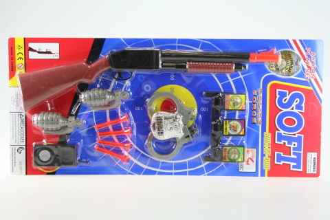 Balení obsahuje plastovou pušku na na natažení - na přísavky,které jsou součástí balení ( 4ks).Součástí jsou dále 2 granáty cca 9 cm,vysílačka,pouta,odznak a terčík cca 13,5 cm X 8 cm - vše z plastu.Rozměr balení cca 25,5 cm X 58 cm.Věk 3+ prečítať celé
