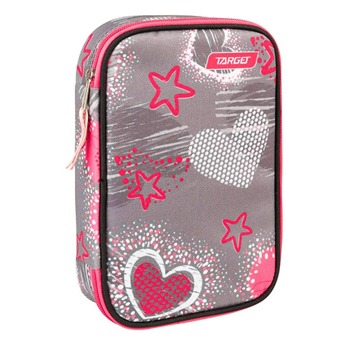 Školní penál s náplní Target Srdce, jednopatrový, růžovo-šedý