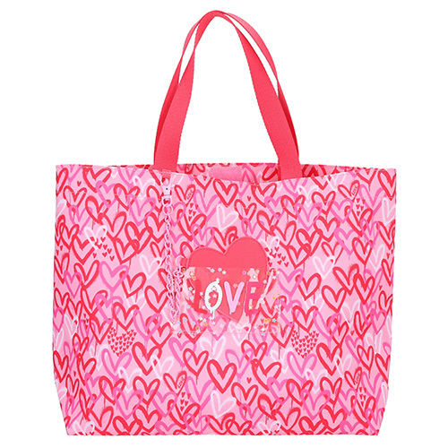 Kvalitní taška se dvěma popruhy přes rameno v designu mimořádně oblíbené kolekce TOP Model je vyrobená z prvotřídních materiálů a představuje praktický a zároveň stylový doplněk Vašeho oblečení. Kabelka disponuje krásným srdíčkovým potiskem, přední malou průhlednou kapsičkou a stylovým přívěskem ve tvaru srdce na řetízku. Taška je zavíratelná na suchý zip a uvnitř naleznete malou kapsičku.Rozměry: 41 x 29 x 13 cm