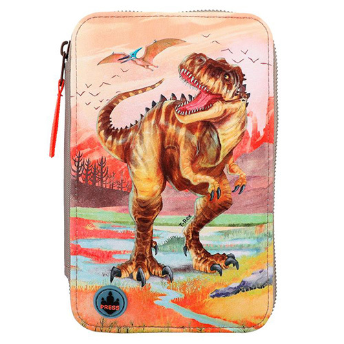 Penál 3 patra s výbavou Dino World, Hnědý T-Rex, pastelové pozadí, se evětelným efektem