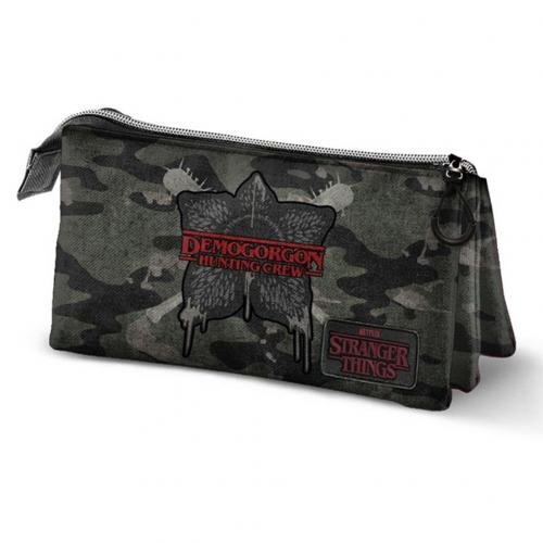 Tříprostorový černý školní penál na tužky se zapínáním na zip a motivem: Demogorgon Hunting Crew.
