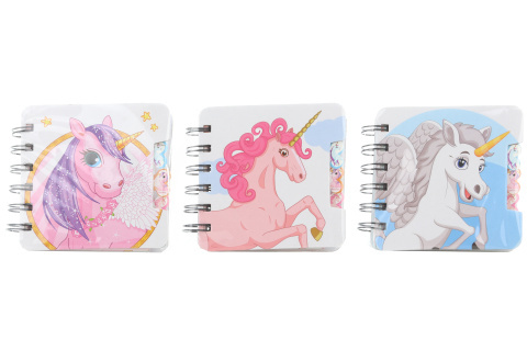 Kroužkový blok s motivem jednorožců. Rozměry cca 10 x 9 x 1 cm. Uvnitř řádkované listy s barevným okrajem. Výrobek není hračka. prečítať celé