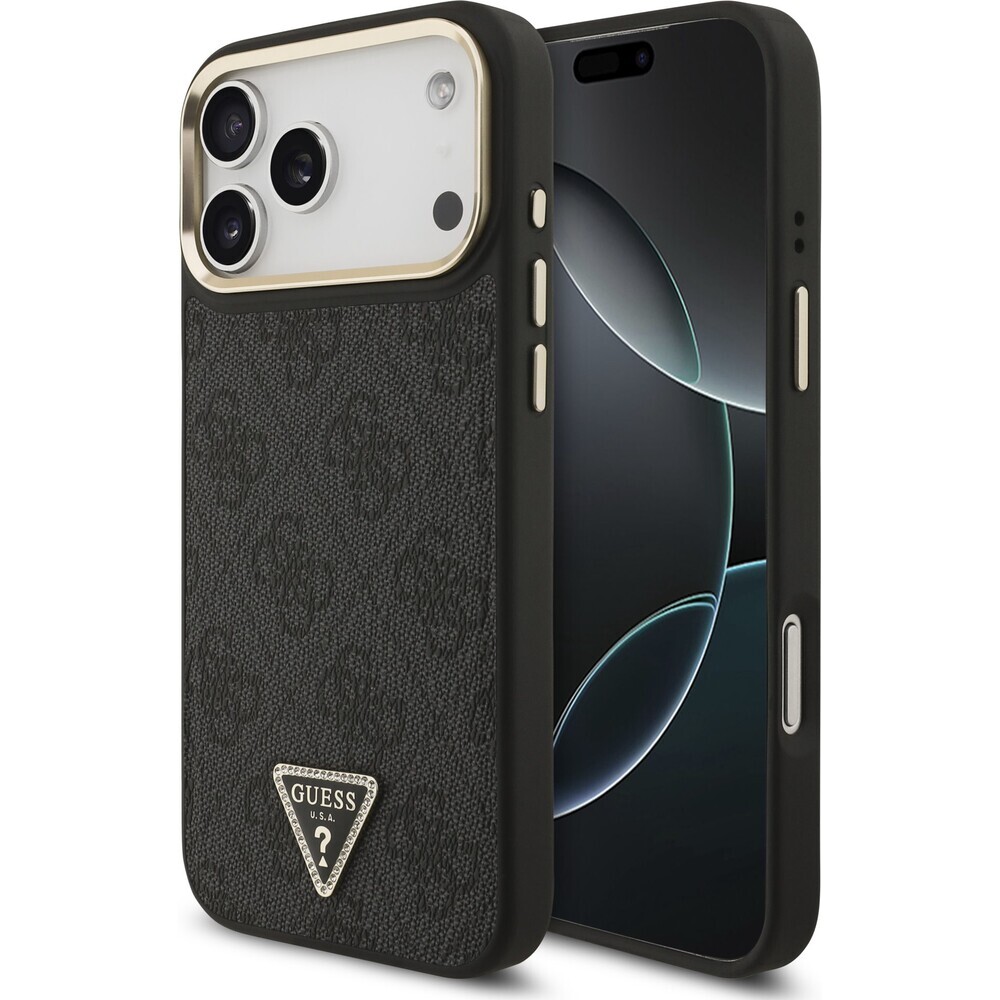 Guess PU Leather 4G Triangle Logo Gold Frame MagSafe kryt iPhone 17 Pro Max černý