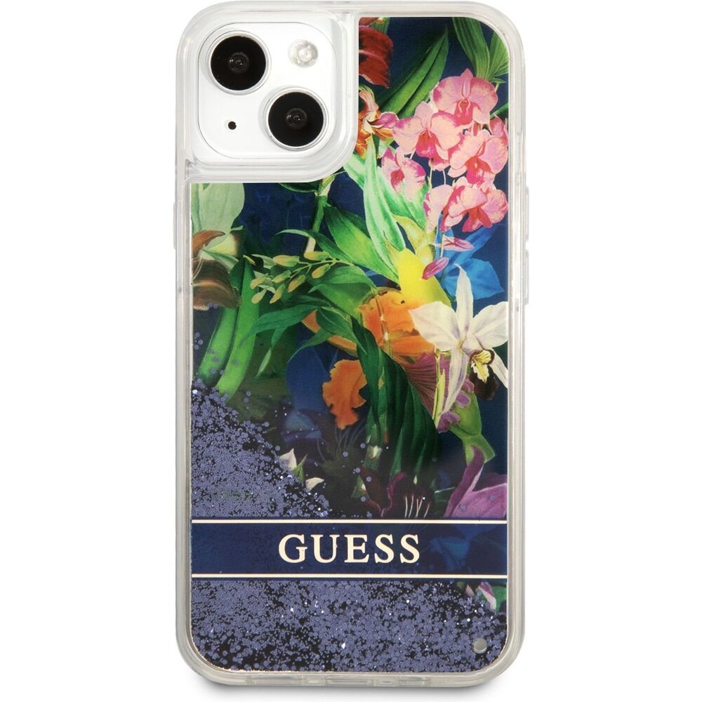 Guess Liquid Glitter Flower kryt iPhone 13 mini modrý