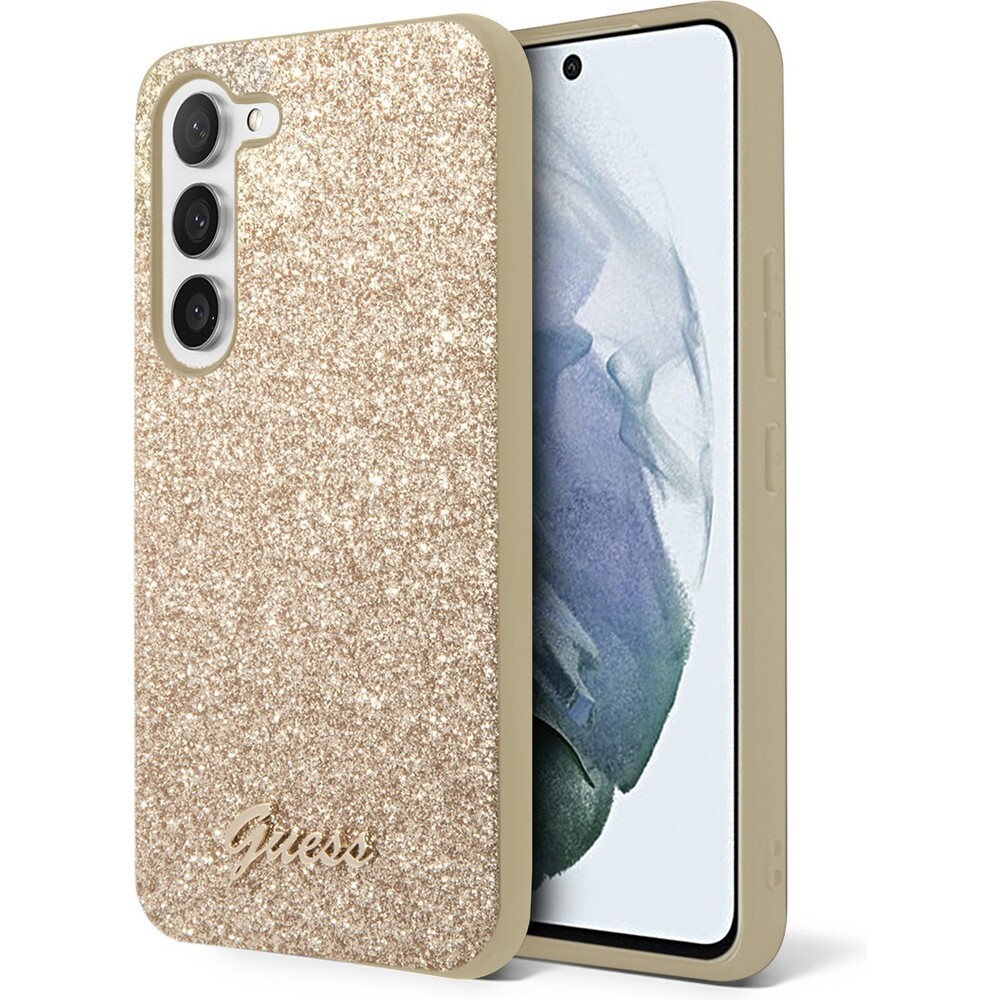 Guess PC/TPU Glitter Flakes Metal Logo kryt Samsung Galaxy S23+ zlatý