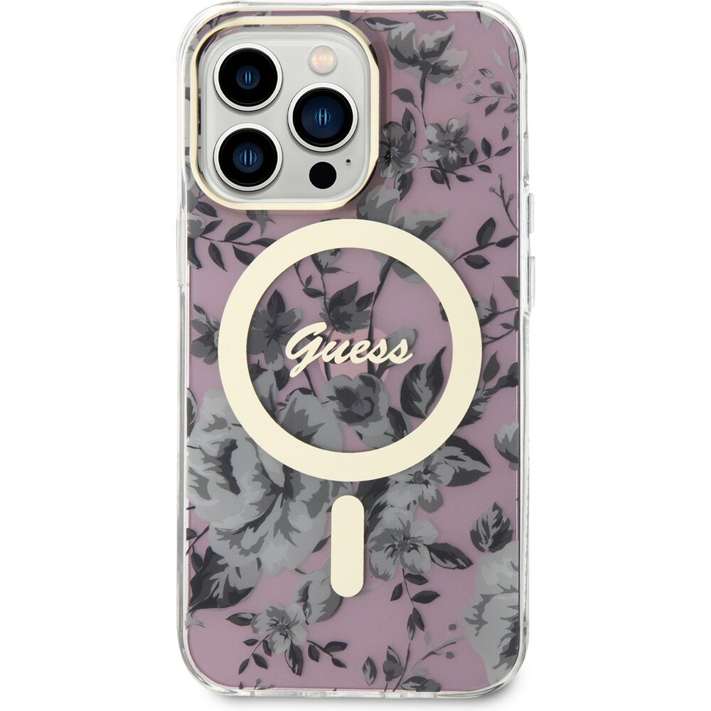 Guess PC/TPU Flowers IML MagSafe kryt iPhone 13 Pro růžový