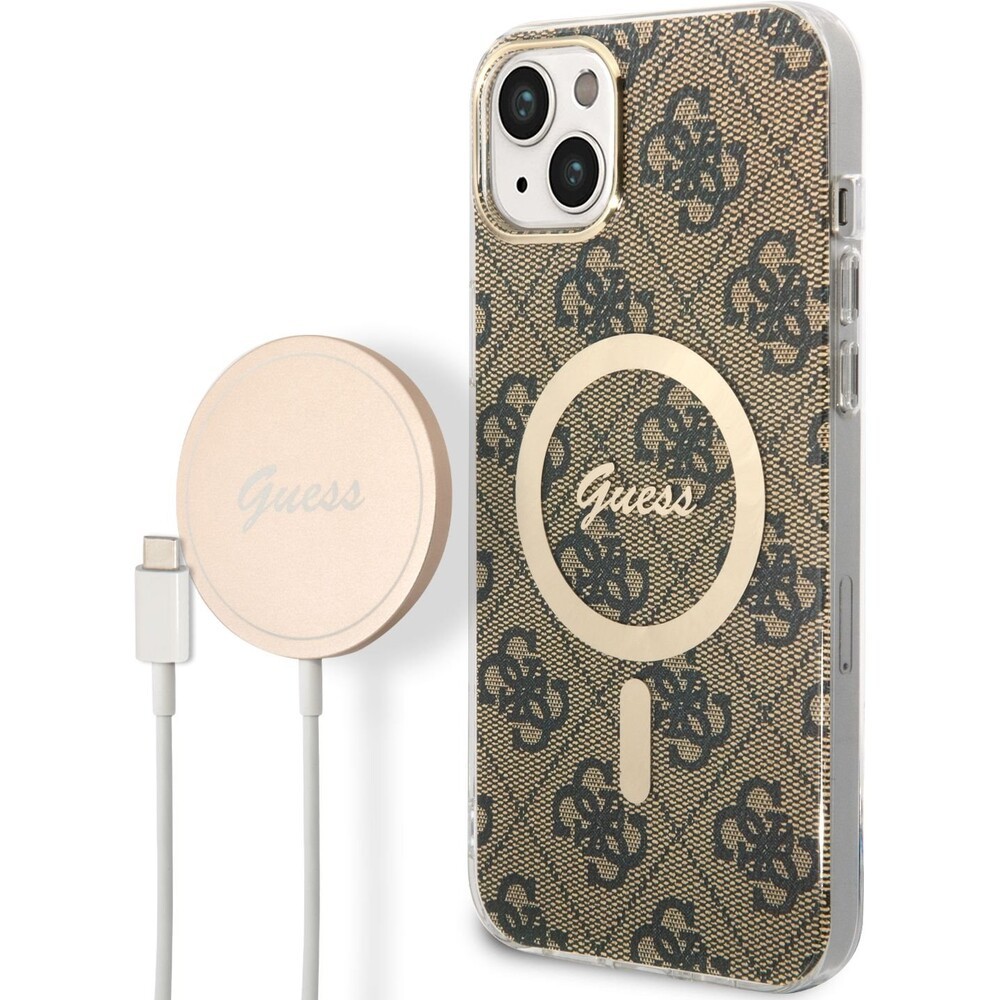 Guess 4G MagSafe kryt + Bezdrátová nabíječka pro iPhone 14 Plus hnědá