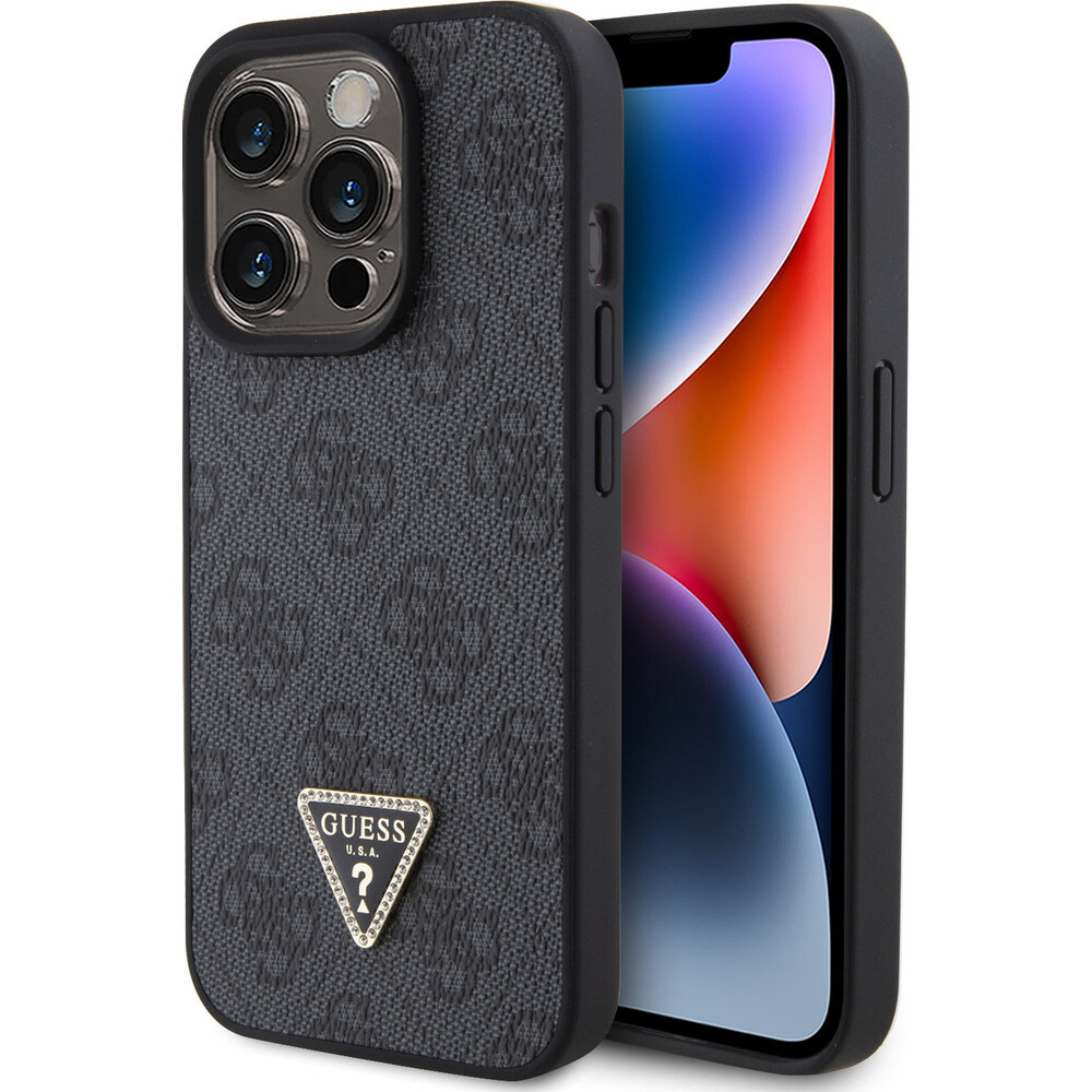 Guess PU 4G Strass Triangle Metal Logo kryt iPhone 15 Pro černý