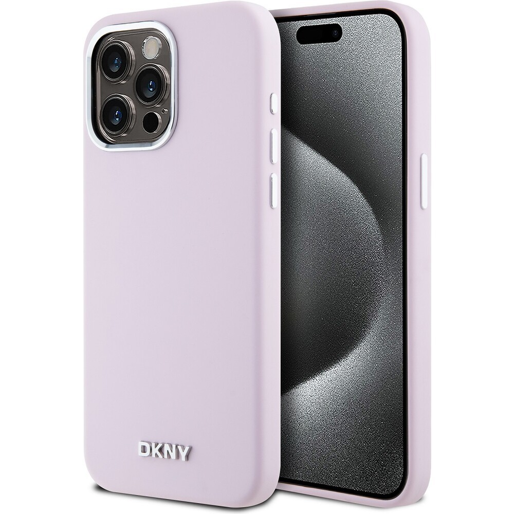 DKNY Liquid Silicone Silver Metal Logo Magsafe kryt iPhone 15 Pro Max růžový