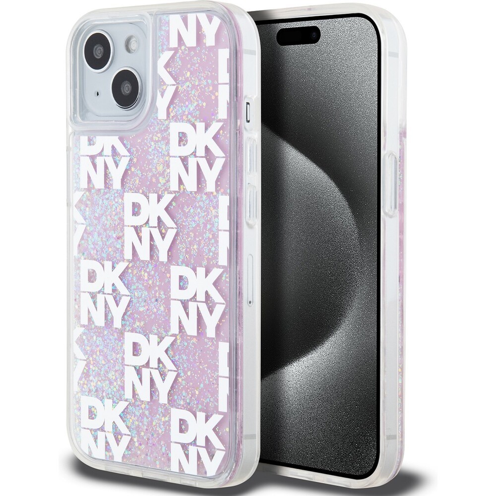 DKNY Liquid Glitter Checkered Pattern kryt iPhone 15 růžový