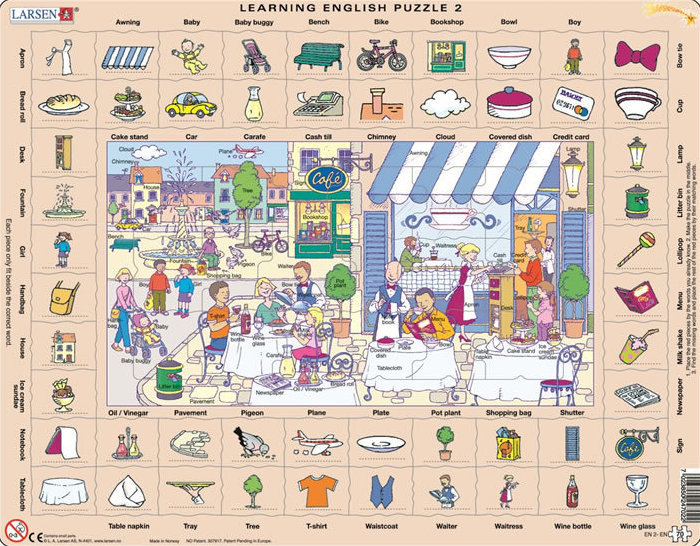 Naučte se 52 anglických slovíček s Puzzle Hodina angličtiny 270 dílků. Uprostřed je malé puzzle s 18 dílky a pevným rámečkem kolem dílků. V hádance je kresba kavárny a pro 52 věcí, které vidíte na kresbě, je 52 anglických slov. Na rámech venku najdete stejných 52 slov a ke každé z věcí je 52...