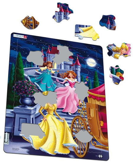 3 princezny scházejí po bálu dolů po schodech z kouzelného zámku.Některé dílky jsou vytvarovány tak, aby je děti snadno objevily.Jsou použité tvary jako oříšek,houba,klíčová dírka,auto a pusa. prečítať celé