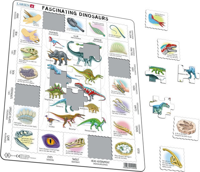 Fascinující svět dinosaurů ukazuje řadu zvláštností, některé jejich atypické rysy i nezvyklé funkční tvary kostí, kůže,… Zároveň se naučíš i názvy některých prehistorických dino. Puzzle má 2 pevné rámečky, jeden vnější a jeden uvnitř. Celkem 35 dílků. prečítať celé