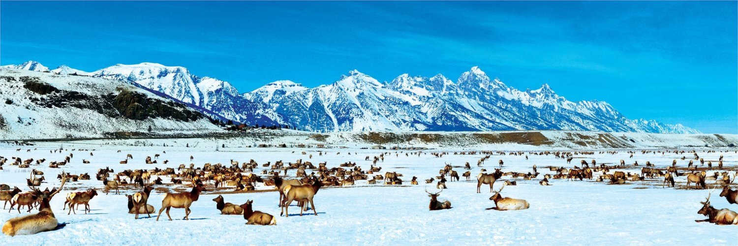 Puzzle s krásnými barvami ze série American Vistas zachycuje panoramatické pohledy na krajinu Spojených Států Amerických. Pohled na stádo losů v oblasti Jackson Hole, Wyoming, USA. Vyrobeno z recyklovaného a recyklovatelného materiálu. Kvalitní silné dílky do sebe těsně zapadají a drží....